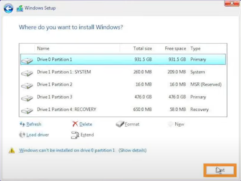 6-4) 드라이버가 설치가 되고 드라이브를 선택할 수 있는 목록이 나옵니다. 자신의 SSD 또는 HDD 또는 파티션을 나누어 적당한 곳을 지정하면 이슈를 해결하고 설치를 진행 할 수 있습니다.