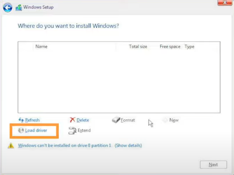 드라이버 로드를 클릭해서 진행하라고 하는데 선택할 드라이버를 가지고 있지 않기 때문에 바로 진행 할 수 없습니다. 그래서 다음과 같은 순서로 이 문제를 해결 할 것입니다.