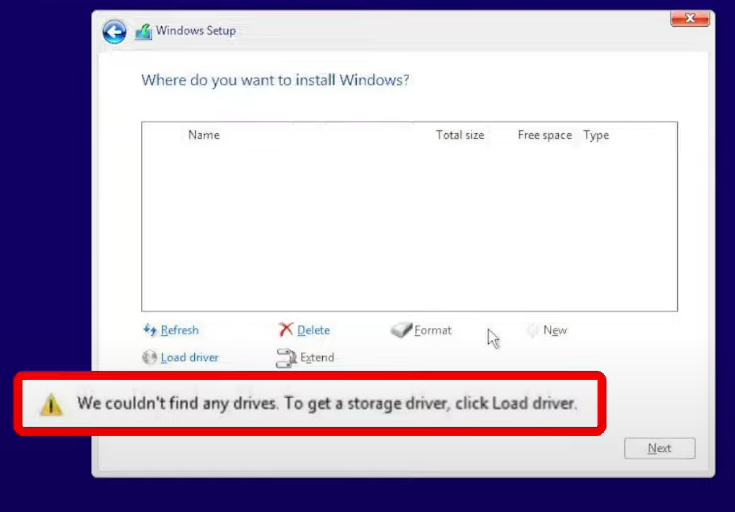 윈도우 11 설치용 USB를 만들어 노트북에 꽂고 부팅을 하면 설치가 진행됩니다. 이 때, '윈도우를 설치할 위치를 선택하세요' 라는 과정을 거치는데요. 원래라면 목록에 드라이브들이 떠야 하지만 ASUS 노트북은 여기서 아무것도 뜨지 않아 더 이상 진행을 할 수 없게 됩니다.