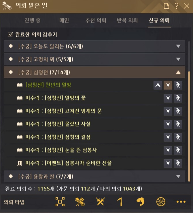 수궁 퀘스트를 진행하기 위해서는 단축키 O를 눌러 의뢰 목록을 열면 <신규 의뢰> 탭에서 수궁 관련된 퀘스트를 받아서 진행 할 수 있는데요. 이 때 목록이 잘 표시가 되지 않는다면 하단에 의뢰 타입에서 '전체'를 체크해 주세요.