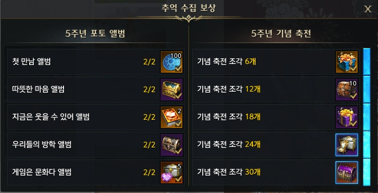 현재 로스트아크 5주년 기념 이벤트가 '빛나는 추억의 섬'에서 진행 중인데요. 5일간에 걸쳐 '흩어진 추억의 미로'까지 모두 하고 나면 '추억 앨범'을 거의 채울 수 있는데요. 확인해 보면 완료된 것이 아닙니다. '5주년 포토 앨범'은 모두 완성되었지만 '5주년 기념 축전'은 아직 미완성 상태인 것을 확인 할 수 있습니다. 물론 추억 수집 보상도 미완성이여서 보상도 모두 받을 수 없고요.