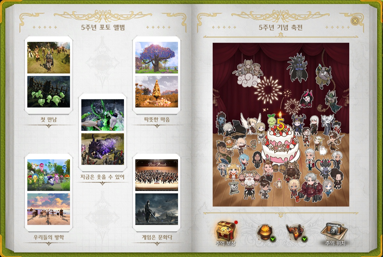 비어있는 5주년 기념 축전을 완성하기 위해서는 사진 촬영을 더 해주셔야 하는데요. 5일동안 미로를 모두 완료하셨다면 다시 미로를 찾아 들어 갔을 때 숨겨진 미로의 포탈과 새로운 장소를 발견 할 수 있을 것입니다. 그곳을 찾아가서 사진 촬영을 더 해 주셔야 5주년 기념 축전을 완성하실 수 있습니다.