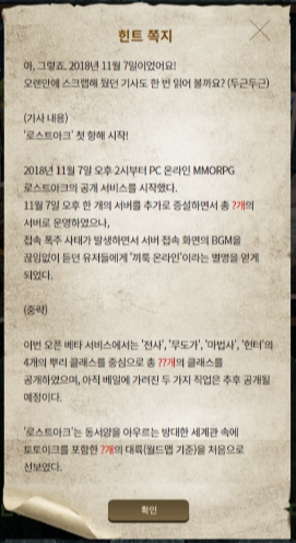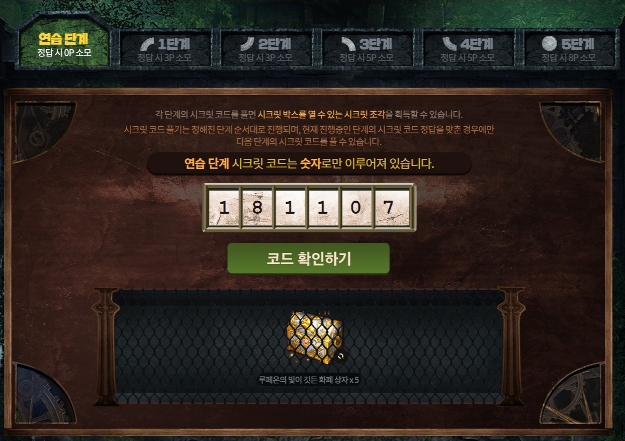 연습 단계의 답은 로스트아크의 론칭일이니 18년 11월 7일이 되겠네요. 그러면 시크릿 코드는 181107이 되겠습니다.