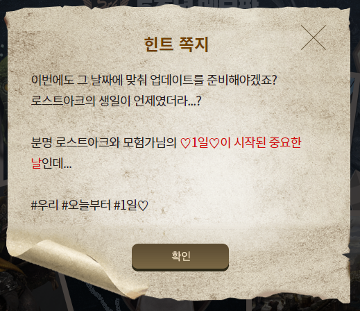 로스트아크에 5주년 기념으로 진행되고 있는 시크릿 코드 이벤트 정답을 모두 정리하려고 합니다. 연습 단계 이번에도 그 날짜에 맞춰 업데이트를 준비해야겠죠? 로스트아크의 생일이 언제였더