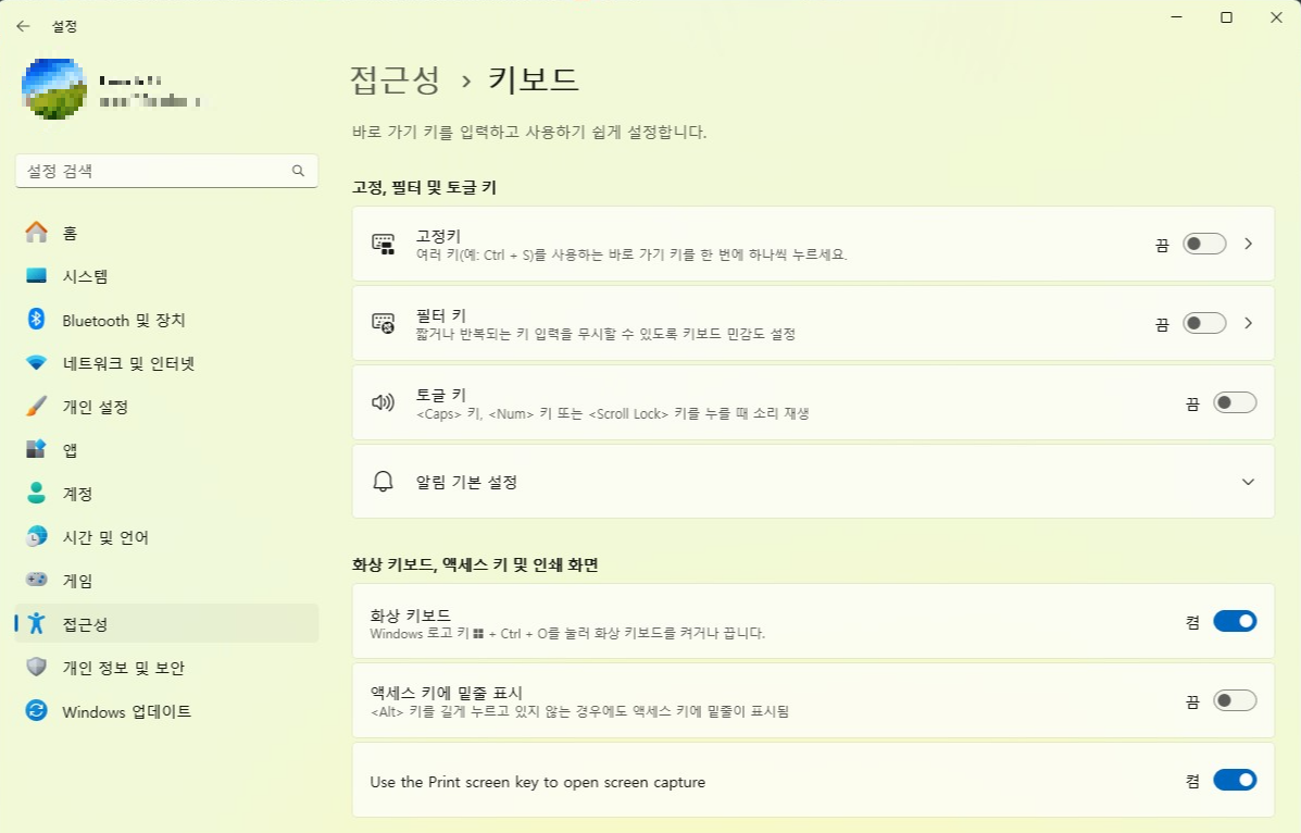 윈도우에서 제공하는 화상 키보드를 사용하기 위해서는 먼저 윈도우키를 누르고 '설정'을 입력 후 선택하여 설정 모드를 진입합니다. 그리고 [설정 - 접근성 - 키보드] 경로로 들어갑니다. 여기에서 화상 키보드를 켜면 위 화상 키보드를 불러 올 수 있습니다.
