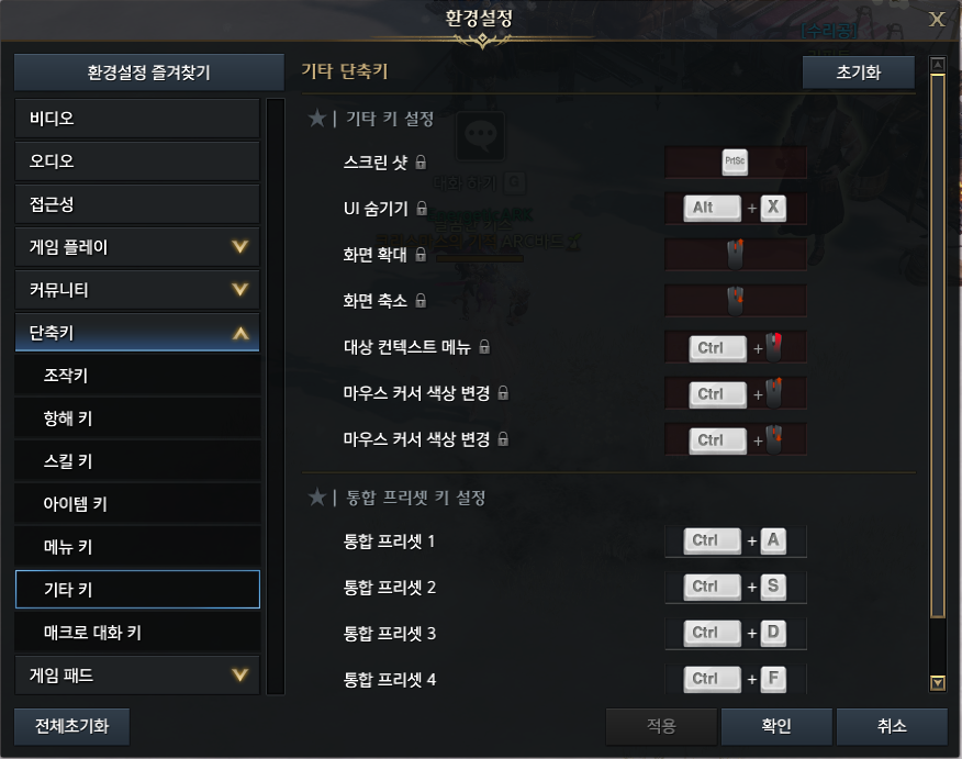 [환경설정 - 단축키 - 기타 키]에서 맨 첫 줄을 보면 스크린 샷은 Print Screen (프린트 스크린)키로 설정되어 있고 잠금이 되어 있어 변경도 할 수 없습니다.
