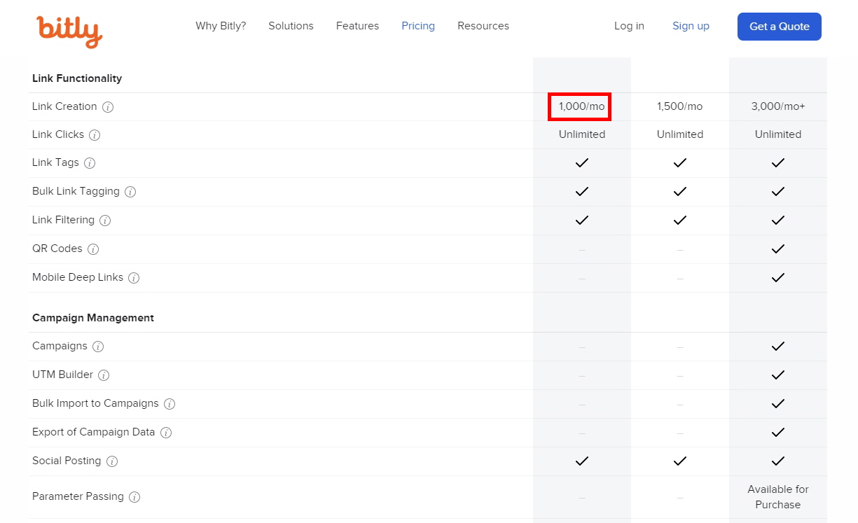 3. 클릭 전에 서비스 내용들을 더 살펴 보기 위해 아래로 내려 보면 Link Creation이 1000/mo라고 나와 있습니다. 한 달에 1000개의 링크를 생성할 수 있다는 내용입니다. 충분합니다 ㅎㅎ
