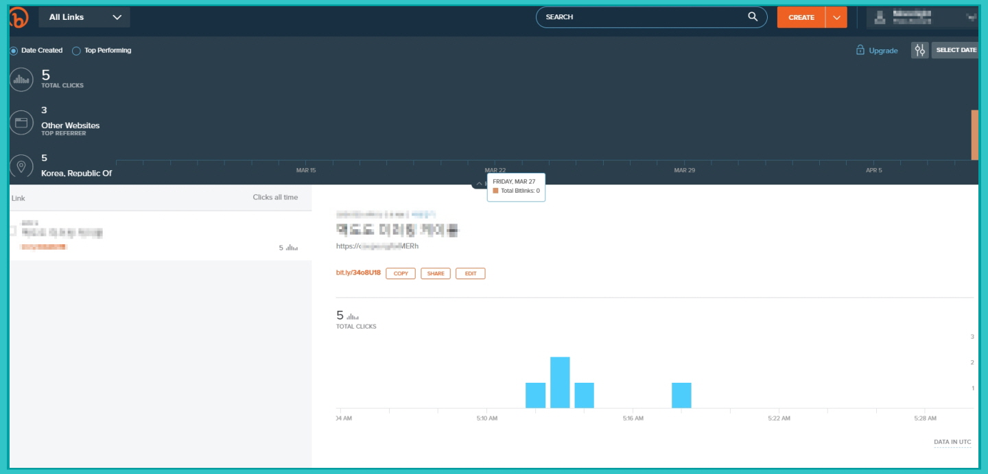 생성된 URL들은 본문에 상세 내역이 나타납니다. 어느 링크가 언제 얼마나 클릭했는지 확인 할 수 있습니다.