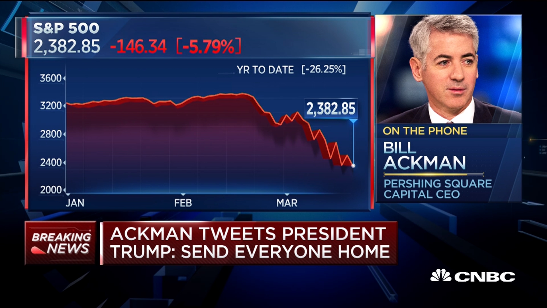 3월 18일, 애크먼이 CNBC에 감정적으로 출연했을 때, 그는 그 직책으로 약을 팔았다. 그는 인명과 경제적 재앙을 피하기 위해 "30일 동안 세계를 닫아달라"고 각국 정부에 요구하면서 목소리가 갈라졌다. 논평자들은 그가 시장을 더 낮게 보내려고 노력하고 있다고 제안했지만, 애크먼은 CNBC에 "공격적으로 주식을 사고 있다"고 말했다. 그는 후에 트위터를 통해 "평생의 바게인"을 보았다고 덧붙였다. 그가 트럼프 행정부가 코로나바이러스의 경제적 파장을 다루고 있다는 신호를 고무하는 것으로 인식한 데 따른 것이다.