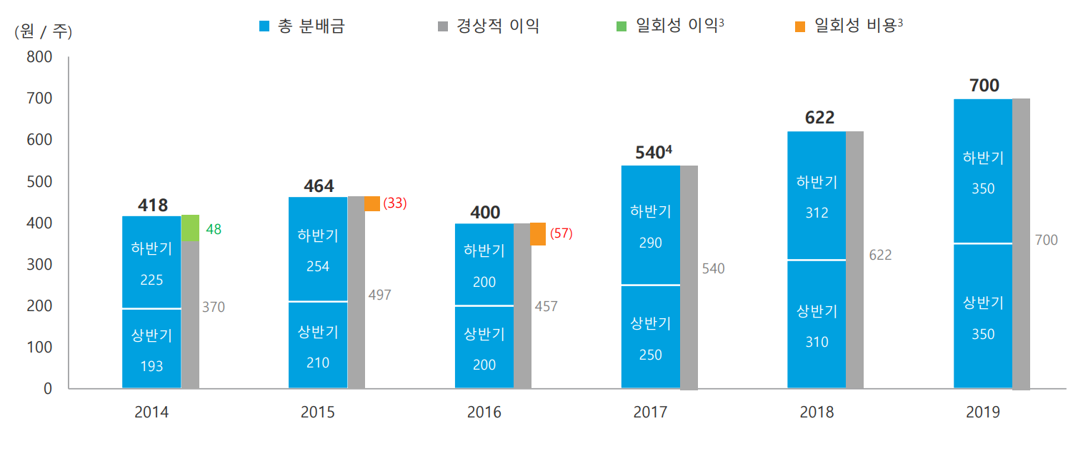 배당성향을 보면 수익을 얻은 것은 모두 투자자에게 돌려주고 있습니다. 배당성향을 100%보면 무방합니다. 2018년에는 주당 595원을 벌어 622원을 분배해 주었고 2019년에는 705원을 벌어 700원을 분배금으로 주었습니다.