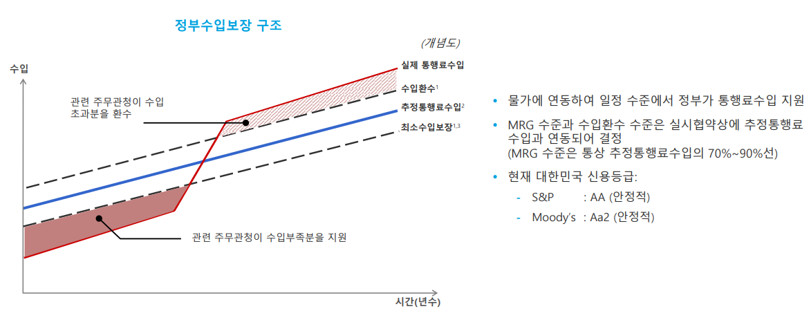 시간이 흘러 사업이 안정화되고 추정 통행료 수입을 너무 오버 슈팅해도 정부로 환원되지만 반대로 사업 초기에 수입이 너무 떨어져도 정부로 부터 보전을 받기 때문에 안정적인 수익 창출이 가능합니다. 국제 신용평가사로 부터도 안정적인 평가를 받고 있습니다.
