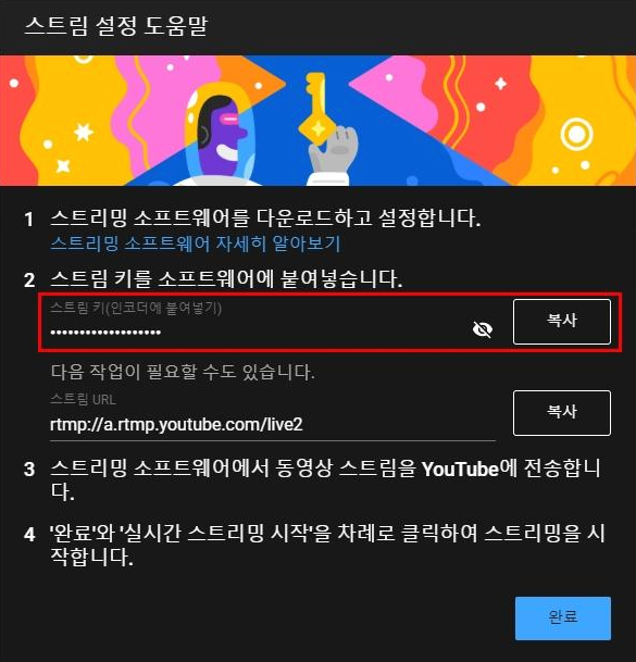 완료 후에도 스트리밍 스튜디오에서도 스트림키를 복사할 수 있습니다.