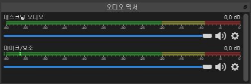 여기에는 입출력 오디오 장치가 표시됩니다. 송출을 원하지 않는 소스는 음소거를 시킬 수도 있고 증폭 설정으로 볼륨 조정도 할 수 있습니다. 예를 들어, BGM(배경음악, Background Ground Music)을 조용히 깔고 내 목소리(Mic) 키워서 믹싱 할 수 있겠죠.