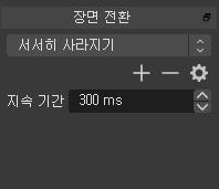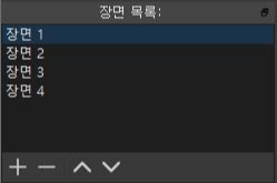 장면 목록 밑에 있는 +, -를 눌러 장면을 추가하고 삭제할 수 있습니다. 위아래 화살표로 순서를 변경할 수 있습니다. 장면 목록에서는 단순 순서이나 소스 목록에 있는 순서는 앞에 있는 것이 화면 위에 표시되고 뒤에 있는 것은 화면 뒤에서 표시됩니다. 그래도 장면 목록에 있는 순서는 프로그래밍될 순서대로 배치를 하는 것이 운영(Operating)에 편리합니다.