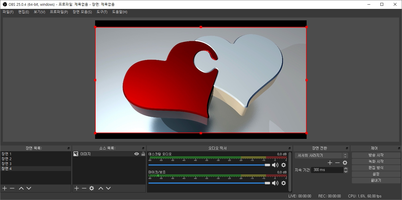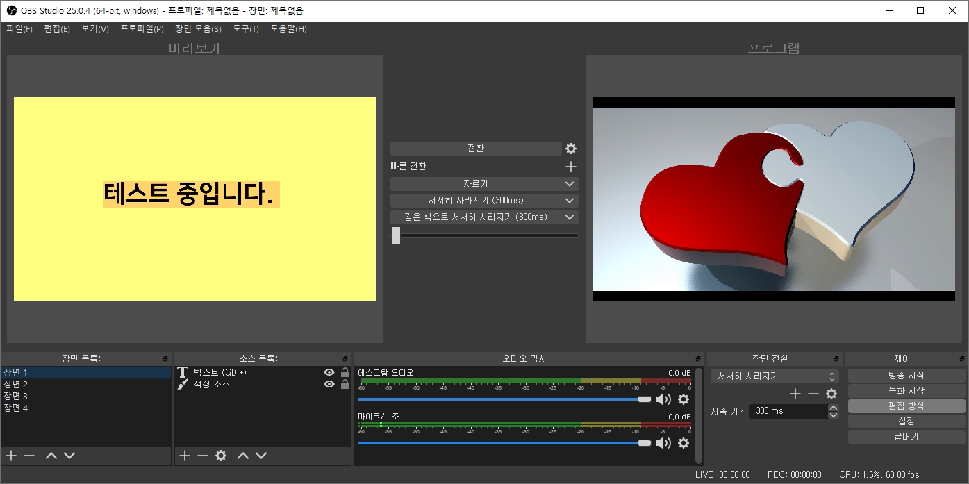 아래에는 장면 목록, 소스 목록, 오디오 믹서, 장면 전환, 제어가 있습니다.