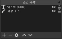 +, - 버튼을 통해 소스를 추가/제거할 수 있으며, 각 소스에 대한 설정도 톱니바퀴 버튼을 클릭하면 세부 사항을 정할 수 있습니다. 위, 아래 버튼은 소스 목록에서 소스의 배열을 정하는 것인데 이것은 단순히 순서를 나타내는 것이 아니라 위에 있는 것이 화면 앞에 표시되고 아래 순서에 있는 것은 화면 뒤에 표시됩니다. 복수의 소스를 사용할 때 이 순서에 따라 화면에 표시되는 모습이 달라집니다.