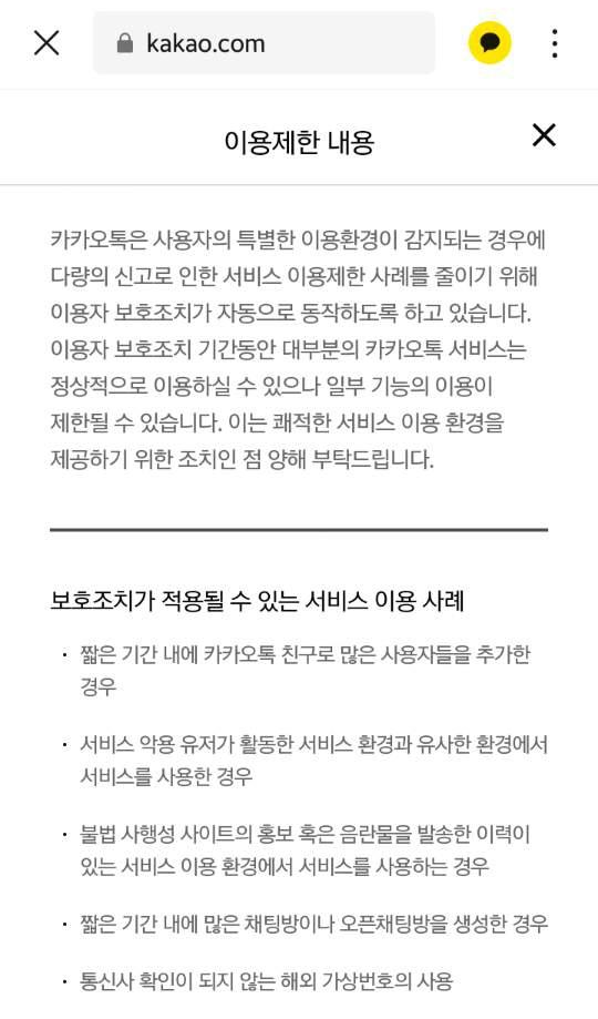 가상번호로 카카오톡을 사용하는데는 몇 가지 제한 사항들이 있습니다. 이것은 기존 카카오톡 이용자를 각종 불법적 행위와 사기와 같은 범죄, 무분별한 스팸 광고로 부터 보호하기 위한 카카오의 조치입니다. 하지만 이것은 몇 주내로 정상 사용자로 판명이 되면 풀리고 정상적인 이용이 가능해 집니다.