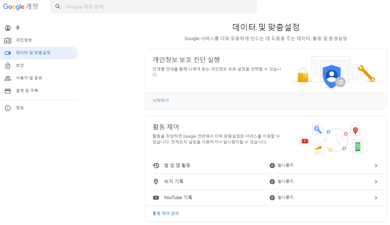 구글 계정 - 데이터 및 맞춤설정으로 들어갑니다.