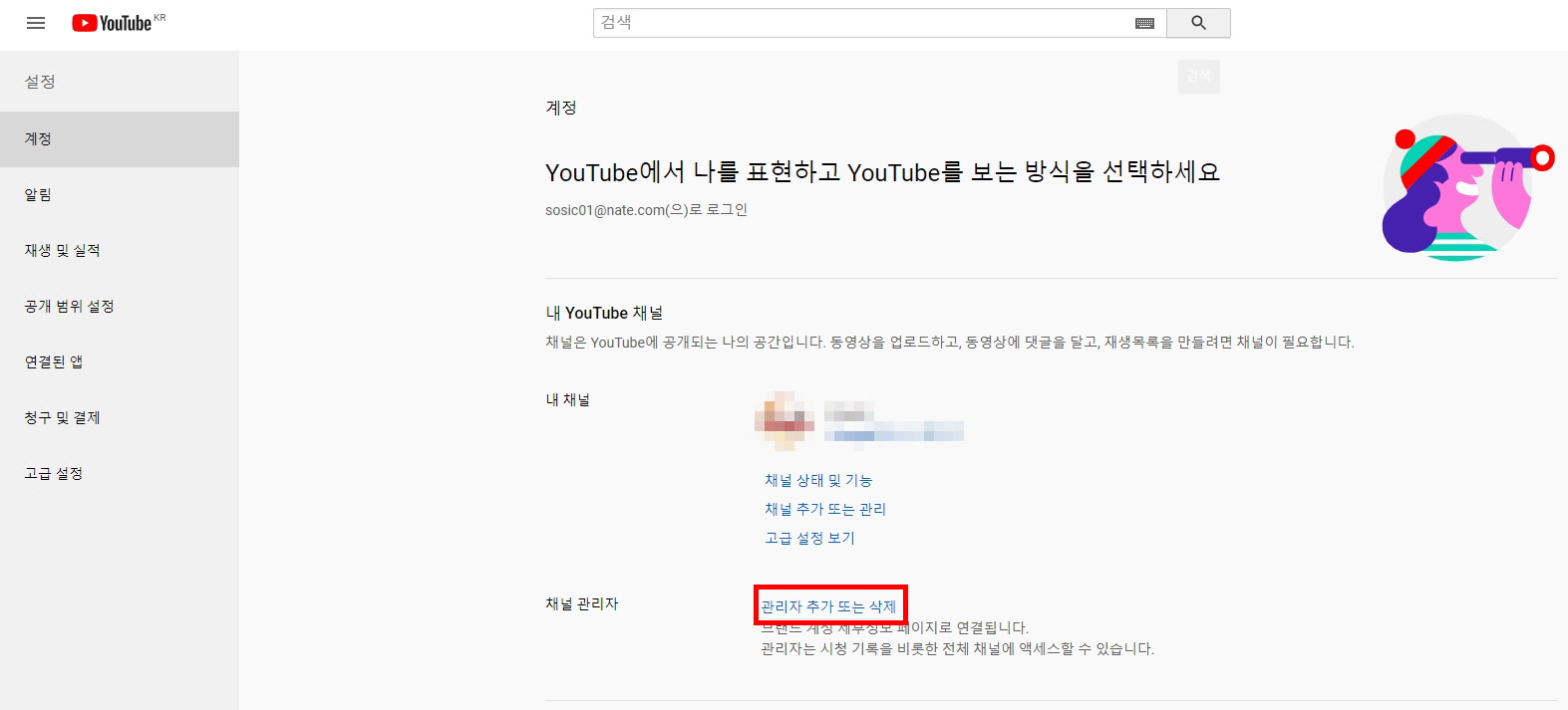 유튜브에 접속한 뒤 우측 상단에 [프로필 - 설정 - 내 Youtube 채널 : 채널 관리자 : 관리자 추가 또는 삭제]로 들어 갑니다.