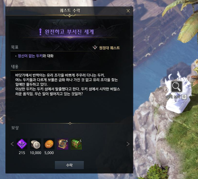 대화를 어느 정도 이어가면 '완전하고 부서진 세계'라는 가이드 퀘스트를 시작할 수 있는데요. 네, 그렇게 시작하면 됩니다.